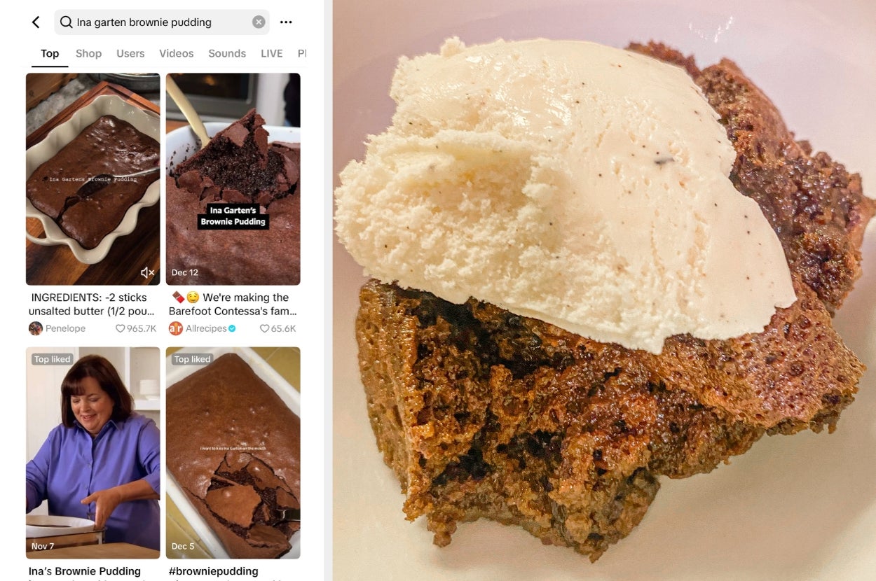 Ina’s famous recipe for brownie pudding has recently gone viral on the app. Unlike regular brownies that can be cut into squares, the brownie pudding has a looser texture, with a hard outside and molten center. Ina credits the recipe to cookbook writer and specialty food store owner Anna Pump. Ina shared the recipe in her cookbook, Barefoot Contessa: Back to Basics, and went on to recreate it in the television adaptation of the cookbook. In November, The Food Network’s TikTok account reposted the video clip of Ina making the dessert. Now, there are countless videos of fans recreating it.