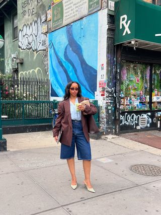 Like me, I’ve noticed that even the most elevated dressers are treating denim shorts as a basic this summer, and are finding fresh ways to style them, as opposed to pairing them with the go-to T-shirt and sneakers. Like jeans, the outfit options for denim shorts are endless, and the ones that are standing out the most to me right now are the elegant ones. It’s actually quite easy to make any type of denim shorts—from short cutoffs to bermudas—if you pair them with polished, elevated pieces.