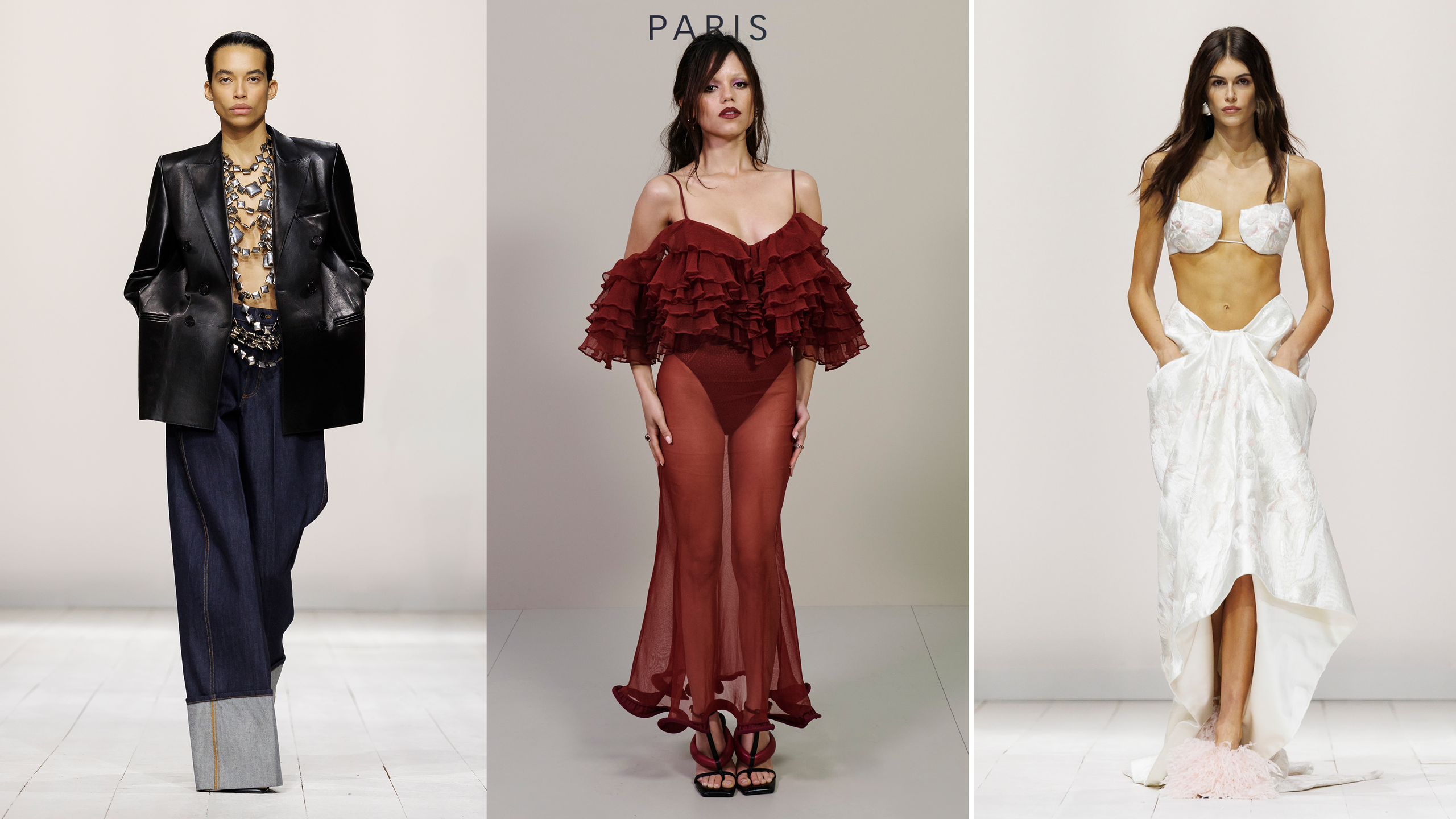 The first looks at Givenchy’s spring/summer 2026 collection didn’t come as models stepped foot on the runway, but before the show even began. Celebrities in attendance arrived in variations on the looks that would, just moments later, appear on the runway. Jenna Ortega wore look 43, a heavily ruffled sheer dress in a deep shade of crimson, and Charlize Theron appeared in an armor of large beads showing through from underneath a crisp white pantsuit. Why wait until award season to see the collected interpreted IRL when you can glance over at the front row?