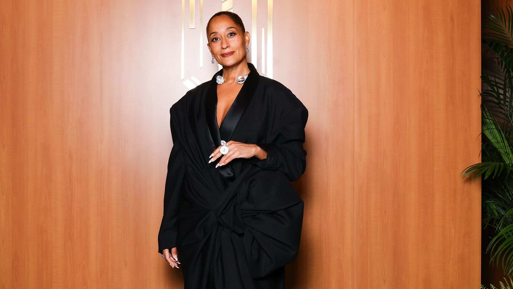 Tracee Ellis Ross accessorized her oversized tuxedo coat-dress with Boucheron diamonds in white gold.