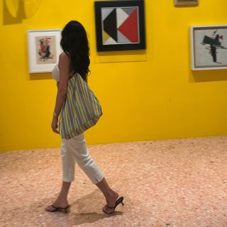 Spotted just this week on Kylie Jenner, the entrepreneur styled the roomy mesh tote for a gallery stop-off in Italy. Selecting the style in multicoloured wash in a playful stripe print, Jenner slung the tote over her shoulders, styling the vibrant bag with calf-grazing capri pants and the prettiest black kitten heels.