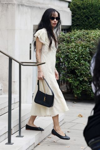 Stepping out in London for a run of press appearances, Kravitz emerged in a butter-yellow Saint Laurent dress paired with glossy black leather ballet flats. Weaving visual contrast into her ensemble, Karvitz doubled down on the unexpected pairing, styling Saint Laurent’s Mini Le 5 à 7 Bag (£1350) and the brand’s SL 567 Sunglasses (£340), both in the same moody shade of black with her creamy yellow dress.