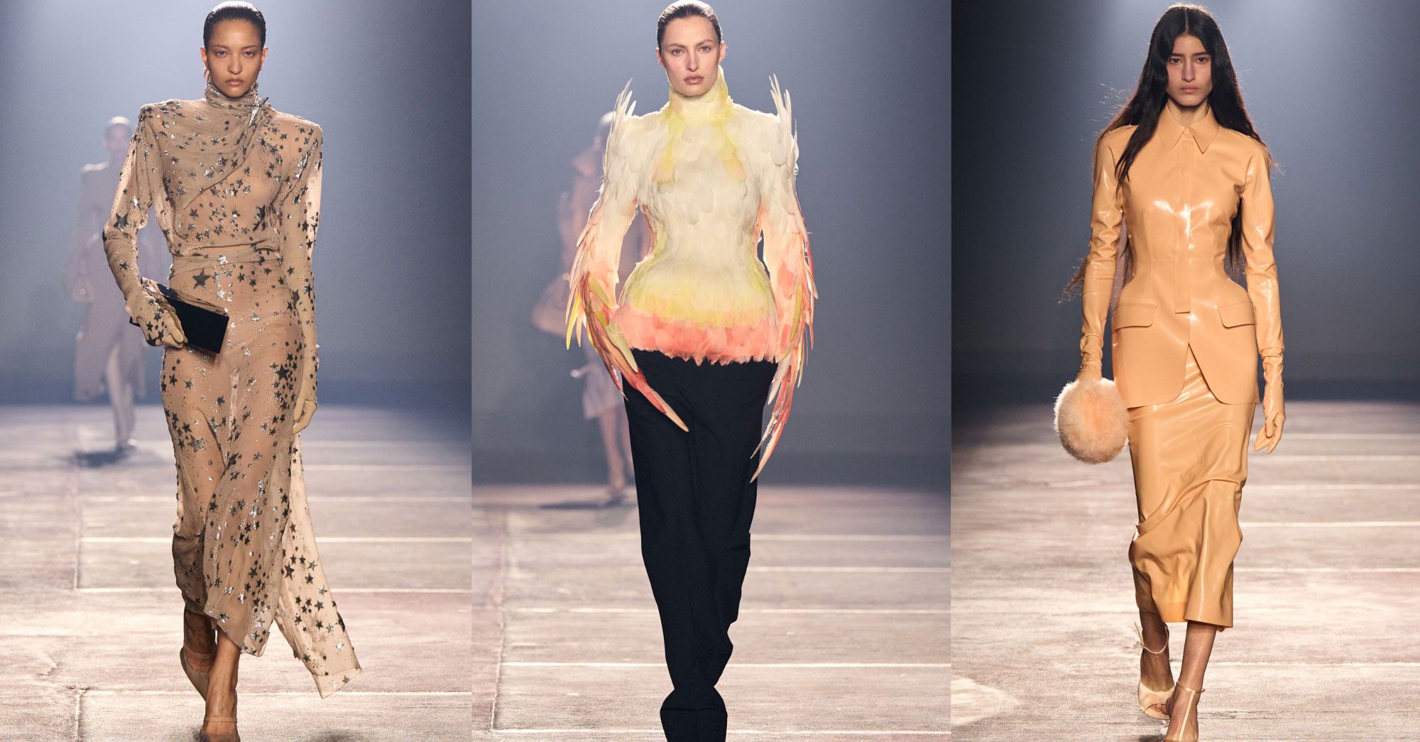 While some portions of the collection featured airy, lighthearted, colorful designs, other pieces were far more solemn in nature. “The showgirl is sublimated darkly, performative with cascades of shredded fringe and sculpted dresses that hover around the body,” Mugler explains.