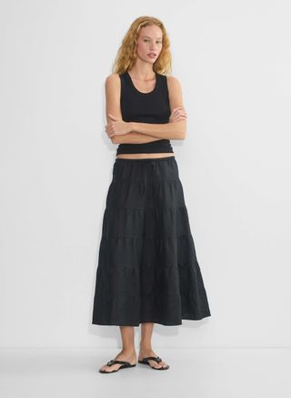 “It’s the year of the skirt! A loose linen skirt is perfect for vacation and warm-weather days. Look for longer midi styles in either a fun print or a basic color that will go with everything.” — Wright