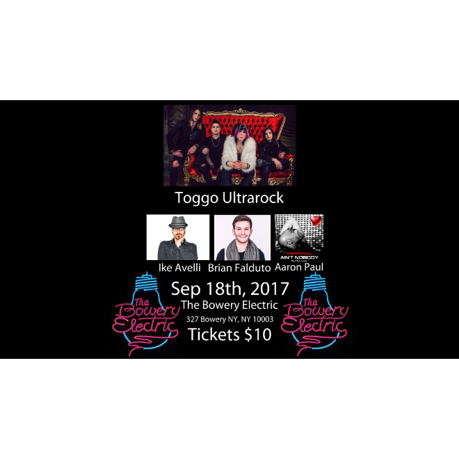 Join comedian Ike Avelli, Singer/Songwriter Brian Falduto, Pop Superstar Aaron Paul and EDM/Rock Artist Toggo Ultrarock at The Bowery Electric in NYC on Monday, September 18, 2017. Don’t miss this amazing show, Tickets are only $10. See you there!
