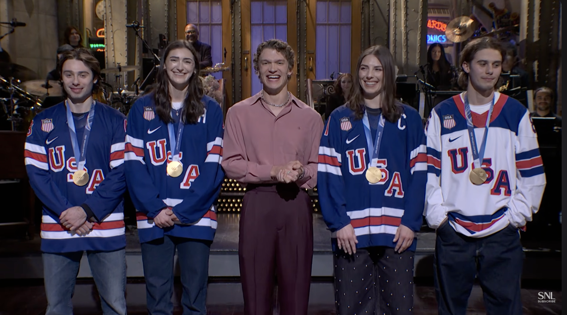Heated Rivalry Star Connor Storrie Saturday Night Live monologue shaded President Donald Trump with help from Team USA hockey players from both men’s and women’s 2026 Winter Olympics in Milan.